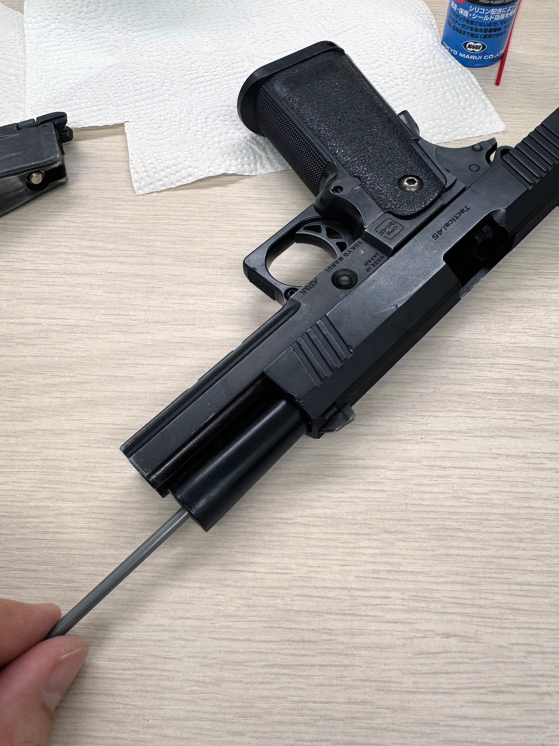 余分なオイルを拭きとって、これでガスブローバックハンドガンのメンテナンスは完了です!